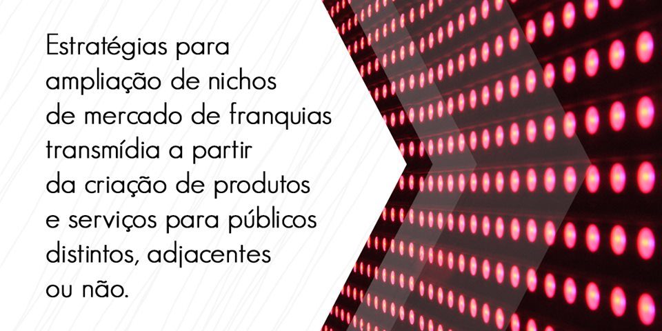 Neste artigo, “ESTRATÉGIAS PARA AMPLIAÇÃO DE NICHOS DE MERCADO DE FRANQUIAS TRANSMÍDIA A PARTIR DA CRIAÇÃO DE PRODUTOS E SERVIÇOS PARA PÚBLICOS DISTINTOS, ADJACENTES OU NÃO”, Mônica Stein e Gabriela Veiga da Silva apresentam uma pesquisa em andamento no G2E – Grupo de Educação e Entretenimento –, da Universidade Federal de Santa Catarina, a qual aborda o mercado de criação de produtos e serviços derivados de uma franquia transmídia.