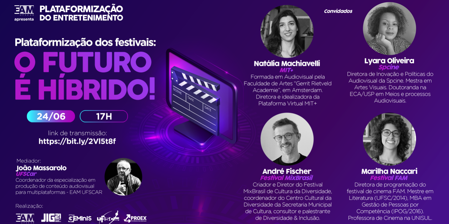 A oitava live, “Plataformização dos festivais de cinema: O futuro é híbrido!“, ocorreu no dia 24/06 às 17h00, com a participação de André Fischer (Festval MixBrasil), Natália Machiavelli (MIT+), Lyara Oliveira (SPCINE), Marilha Naccari (Festival FAM), com a mediação de João Carlos Massarolo (UFSCar). O debate foi transmitido no Facebook pelo link: https://bit.ly/2Vl5t8f