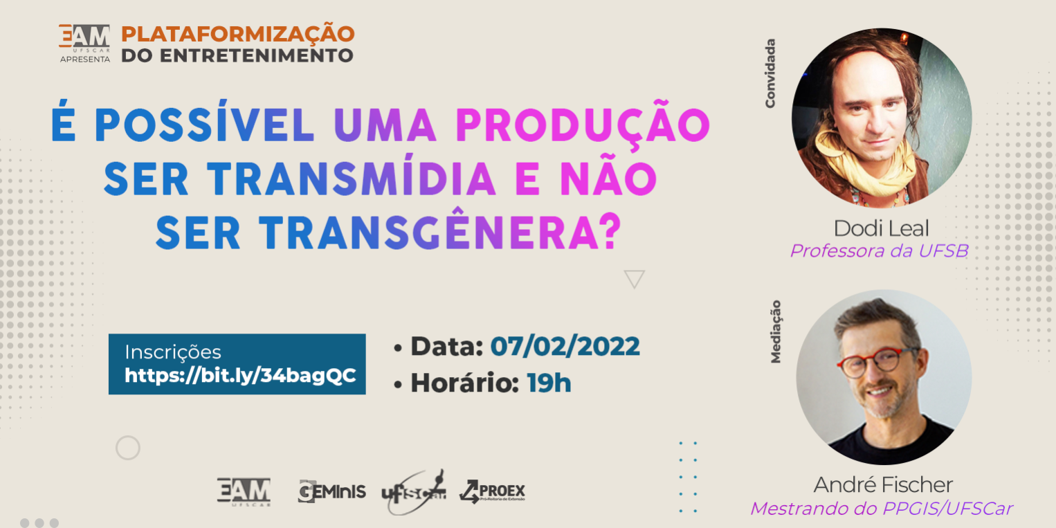 A décima primeira live, “É possível uma produção ser transmídia e não ser transgênera?“, ocorrerá no dia 07/02 às 19h, com a participação de Dodi Leal (UFSB), e a mediação de André Fischer (PPGIS/UFSCar). Inscreva-se abaixo para receber o certificado de participação. O debate será transmitido pelo canal do YouTube da EAM: https://bit.ly/32xZtQ6.