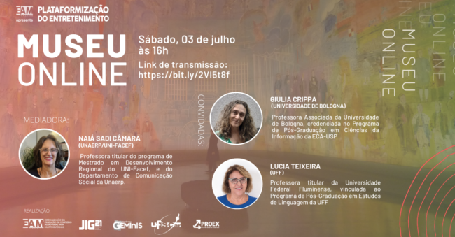 A nona live, “Museu Online”, ocorreu no dia 03/07 às 16h, com a participação de Giulia Crippa (Universidade de Bologna) e Lucia Teixeira (UFF).