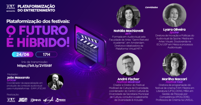 A oitava live, “Plataformização dos festivais de cinema: O futuro é híbrido!”, ocorreu no dia 24/06 às 17h00, com a participação de André Fischer (Festval MixBrasil), Natália Machiavelli (MIT+), Lyara Oliveira (SPCINE), Marilha Naccari (Festival FAM), com a mediação de João Carlos Massarolo (UFSCar).