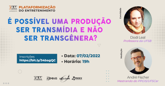 A décima primeira live, “É possível uma produção ser transmídia e não ser transgênera?”, ocorerrá no dia 07/02 às 19h, com a participação de Dodi Leal (UFSB), e a mediação de André Fischer (Festival MixBrasil). Inscreva-se abaixo para receber o certificado de participação.