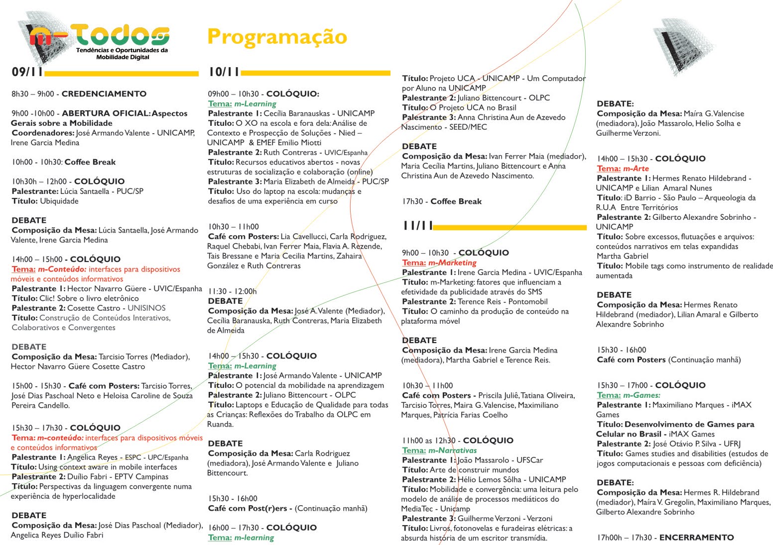 O m-Todos contará com a presença de palestrantes com Carlos Scolari (Universidade Pompeu Fabra – Barcelona/Espanha), Lucia Santaella (PUC-SP), João Massarolo (UFSCar), Hector Navarro Güere (Universidad de VIC-Espanha), Hermes Renato Hildebrand (Unicamp), dentre outros, distribuídos pelas seguintes linhas de investigação: