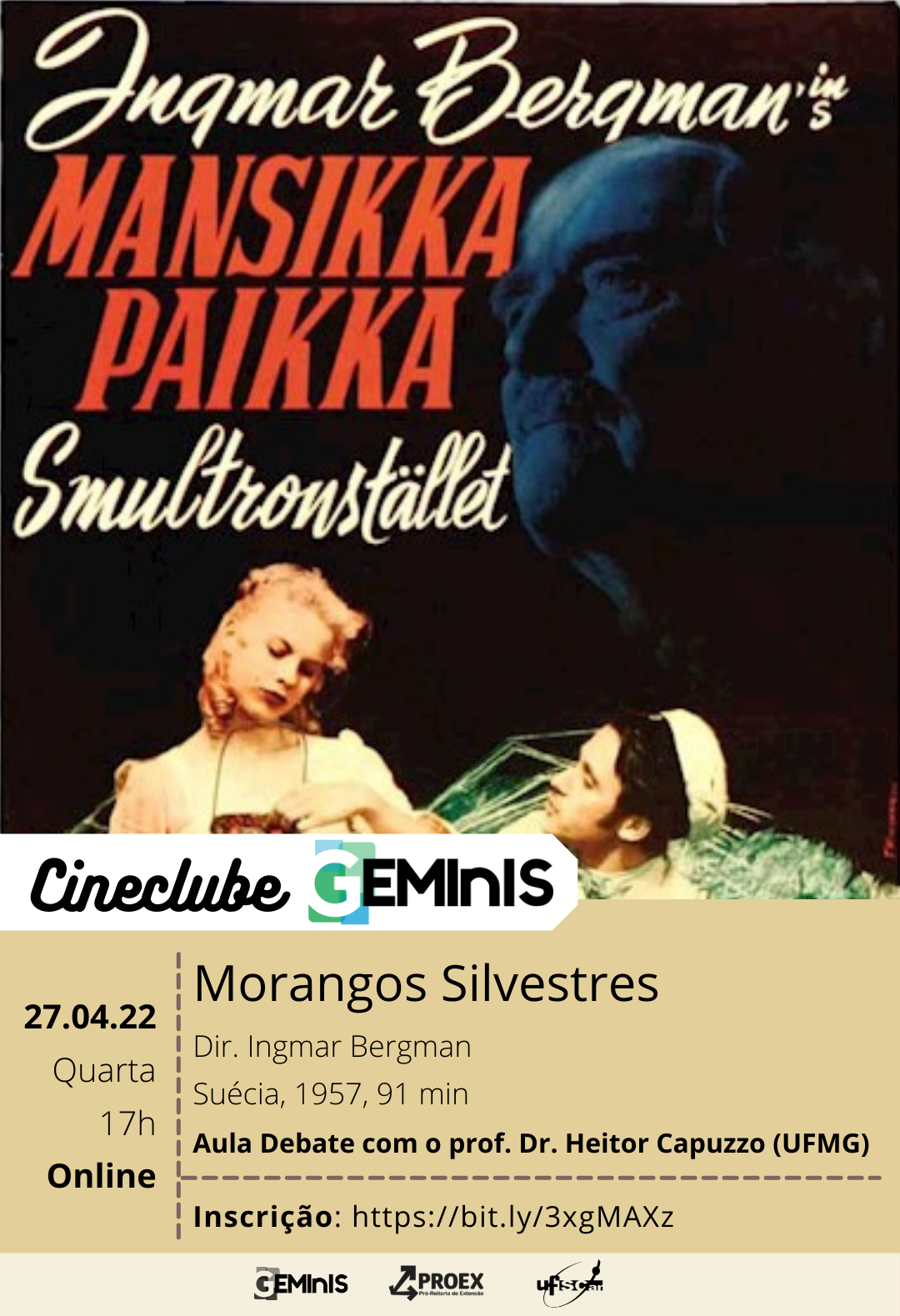 No dia 27/04/22 (quarta-feira), às 17h, o Cineclube GEMInIS realizará uma aula debate sobre o filme “Morangos Silvestres” (1957, SE, 91min), considerado um dos maiores clássicos da História do Cinema. Dirigido pelo sueco Ingmar Bergman, o filme apresenta os momentos que antecedem a cerimônia de consagração pública de um professor cientista com idade já avançada. O trajeto entre a sua residência e a Universidade transforma-se metaforicamente numa linha do tempo, com a consequente revisão de vida.