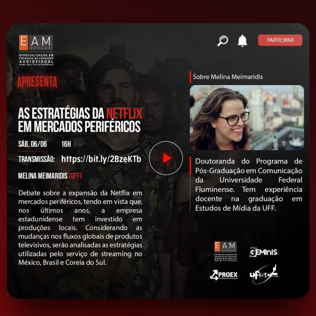 Transmissão: https://bit.ly/2Vl5t8f Inscrição para Certificado*: https://bit.ly/30JuITp *IMPORTANTE: Para o recebimento do certificado, o credenciamento deve ser feito na sala online (conferenciaweb.rnp.br/webconf/eam-ufscar), no momento da transmissão. O regime de distanciamento social potencializou as práticas culturais emergentes das lives, reconfigurando a interação entre o público e os artistas. Tal fenômeno foi possibilitado pela plataformização das…